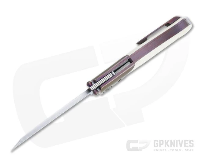 Handle: Solid anodized titanium liners support contoured, polished G10 handle scales flush fit to anodized titanium bolsters for a comfortable grip on the sweeping ergonomic handle. The scalloped liner lock is easy to operate and delivers solid lockup for safe use while the anodized back spacer provides balance in hand. All titanium parts have a matching violet bronze anodized finish that complements the Ivory G10 scales. Includes information card and custom printed microfiber storage bag.