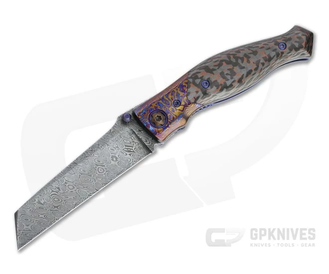Handle: Solid anodized titanium liners support contoured, polished Snakeskin Fat Carbon handle scales flush fit to Timascus bolsters for stunning visual appeal and a comfortable grip on the sweeping ergonomic handle. The scalloped liner lock is easy to operate and delivers solid lockup for safe use while the anodized back spacer provides balance in hand. All titanium parts including the custom milled pivot and collars have an anodized finish to complement the Timascus colors. Includes information card and custom printed microfiber storage bag.