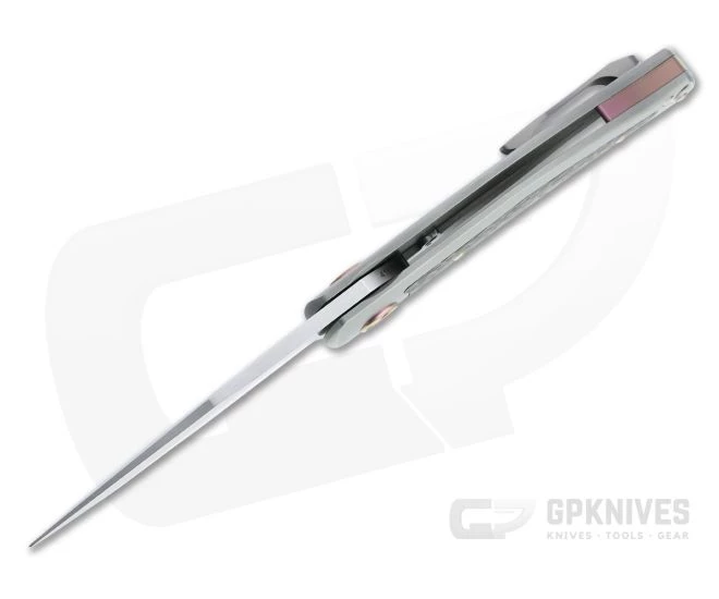 Handle: Fine bead blasted titanium handle scales are contoured for comfort with a classy matte gray look. The front scale is inlaid with carbon fiber, a stunning copper “snakeskin” from Fat Carbon, complemented by anodized titanium hardware, pivot collars and back spacer. The rear scale is an integral frame lock with hardened steel lock face and over travel stop for solid lockup and a lifetime of flawless operation. Includes a high-quality felt storage pouch and certificate of authenticity.