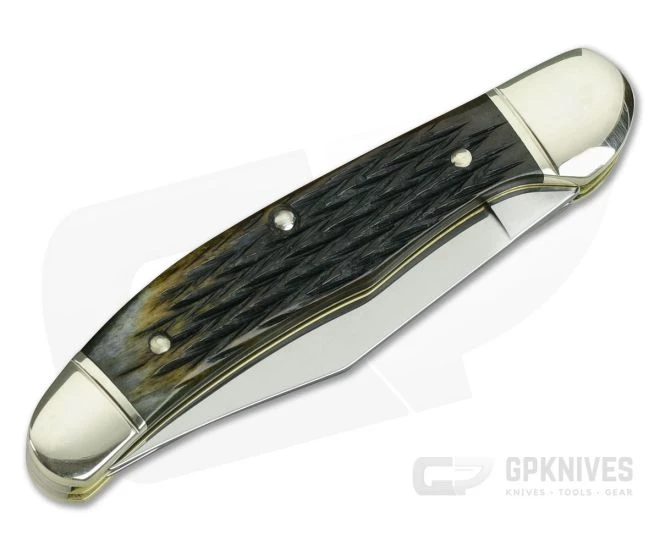 The Copperhead is a classic folding knife pattern with an iconic two-blade combination similar to the Trapper and slip joint construction designed for a variety of uses. This high-quality interpretation from Boker knives of Germany employs a polished carbon steel blade with classic etch traditionally reserved for premium knives. The Copperhead handle sports dual nickel sliver bolsters and and brass liners for a traditional slip joint construction. This version comes with Jigged Green Bone scales for a handsome look and timeless feel, just what you want in a classic design. A winner for users and collectors alike.