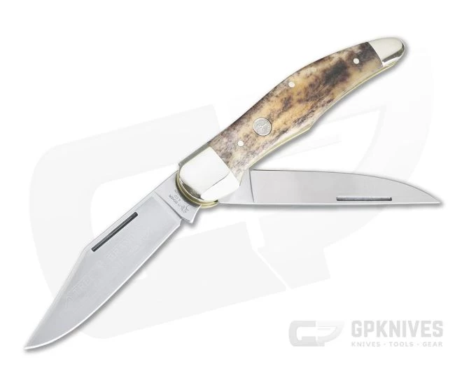 The Folding Hunter is a classic large folding knife with a dual blade slip joint designed for outdoor use with a timeless appeal. This high-quality interpretation from Boker knives of Germany employs dual, polished carbon steel blades with a classic etch traditionally reserved for high quality knives on the main blade. The Folding Hunter Knife handle sports dual nickel sliver bolsters and brass liners for a traditional slip joint construction. This version comes with handsome Buckskin Bone scales for a rugged and timeless feel, just what you want in a classic, robust design. A winner for users and collectors alike.