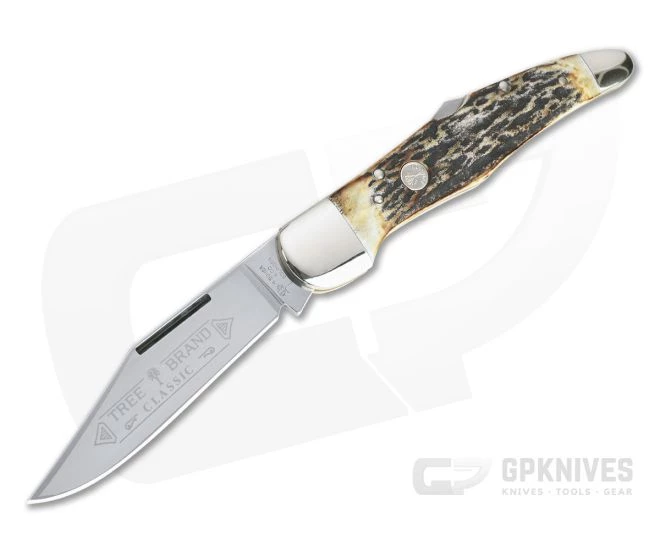 Blade: The Folding Hunter sports a single, large clip point blade executed in polished carbon steel with a long pull and smooth back lock operation. The full flat grind makes this a very functional and utilitarian blade for users while collectors will be pleased with the visual appeal of the classic Tree Brand logo etch contrasted with the bright, polish finish.