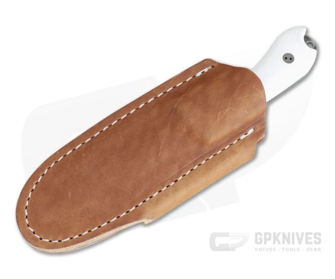 Handle: Dual White G10 scales are supported by the full tang construction and are easily removable for cleaning and maintenance. Milled with a full 3D contour, the scales are comfortable and ergonomic while offering a secure grip thanks to the machined micro textured. Lightweight, durable and weather resistant, the White G10 scales are clean and visually striking. Utilizing the forward finger choil allows for a four finger grip even with the more compact handle design. The scales are secured to the tang via black oxide finished 416 stainless custom fasteners heat treated to 40 Rc for durable security. An exposed portion of the tang at the pommel has a hole for lanyard attachment for added retention.