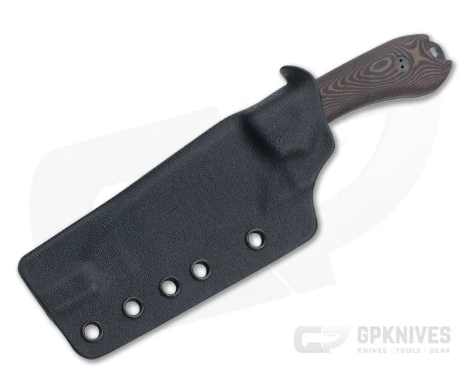 Handle: Thick, 3D contoured Chocolate brown and red Richlite scales are supported by the full tang construction and are easily removable for cleaning and maintenance. The scales are comfortable and ergonomic while offering a secure grip. Richlite is a recycled paper and phenolic resin composite similar to Micarta that offers the durability and weather resistance of a modern composite with the rich, organic feel of a natural material. Utilizing the forward finger choil allows for a four finger grip with a more compact handle design. The scales are secured to the tang via black oxide finished and heat treated (40 Rc) 416 stainless custom fasteners while a hole at the pommel allows for lanyard attachment.