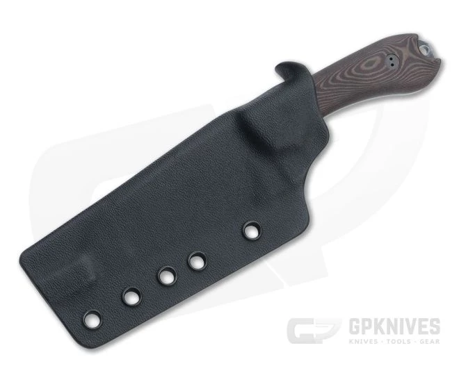 Handle: Thick, 3D contoured Chocolate brown and red Richlite scales are supported by the full tang construction and are easily removable for cleaning and maintenance. The scales are comfortable and ergonomic while offering a secure grip. Richlite is a recycled paper and phenolic resin composite similar to Micarta that offers the durability and weather resistance of a modern composite with the rich, organic feel of a natural material. Utilizing the forward finger choil allows for a four finger grip with a more compact handle design. The scales are secured to the tang via black oxide finished and heat treated (40 Rc) 416 stainless custom fasteners while a hole at the pommel allows for lanyard attachment.