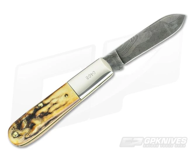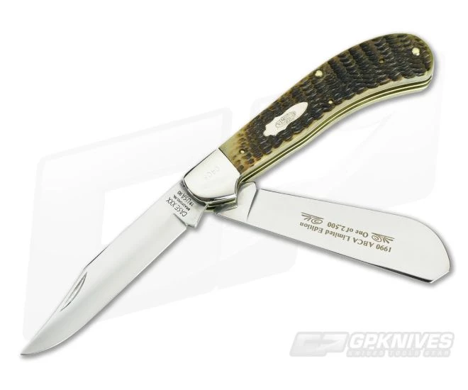 Rare 1990 American Blade Collectors Association Limited Edition Saddlehorn set. Both knives serialized # 0408 of 2500. The 2-Blade CASE XXX USA Saddlehorn master clip blade blade was the first ever to bear the ‘Case XXX’ tang marking. It is 4-5/8 inches closed, 8-1/4 inches open. Both blades are mirror polished stainless. The back of secondary skinner blade is stamped with the pattern number G ROG 62100 SS and the 1990 ABCA logo. The single spear point damascus Barlow is 4 3/4″ open and a closed length of 3 3/8″. Includes original collector’s folding case.
