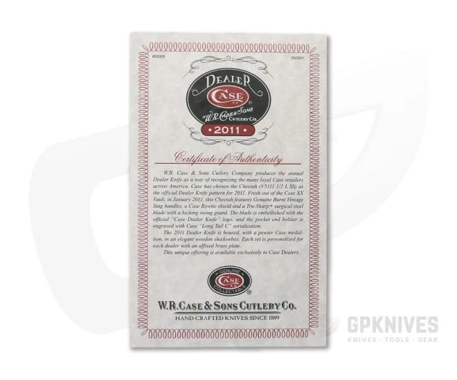 This Case 2011 Dealer Knife display features the Cheetah (V5111 1/2 L SS) pattern in Tru-Sharp stainless steel with “Case Dealer Knife” logo etch, “Long Tail C” serialization engraved bolster and stag covers. This “XX Tested” display gives the history of the now iconic “XX” mark. Available to dealers once a year, these highly collectible display sets are exceedingly rare and difficult to acquire. Includes wooden display box and certificate of authenticity.