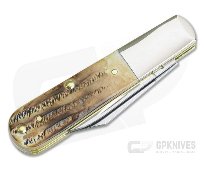 Handle: A single, yet sizable polished nickel silver bolster compliments the Barlow’s handsome design. Specially jigged and hand flamed 6.5 Bone Stag scales meet up to it perfectly. They’re pinned to brass liners and fit in the hand comfortably. This version has a Classic Case Oval shield on the front cover. Solid, stainless back springs provide good walk and talk on this timeless slip joint design.