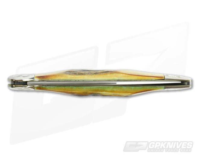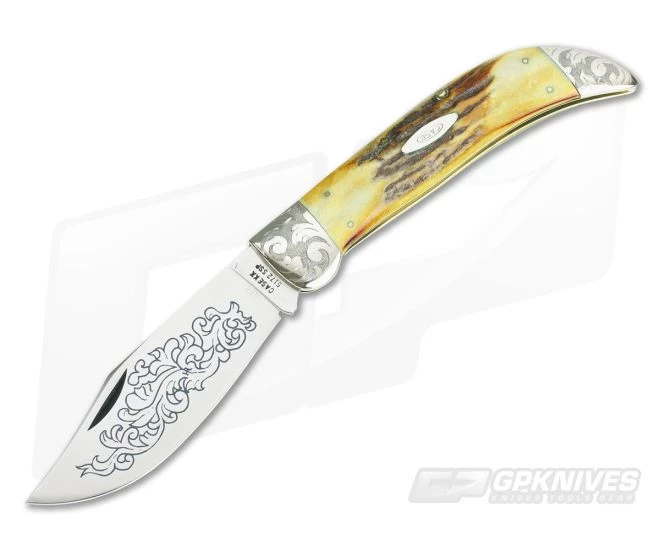 Case XX U.S.A. 3 Dot (1977) Blue Scroll Folding Clasp pattern in mint condition. Featuring satin finished large clip blade with blue scroll etch. Blade has gator like snap, no rubs. Aged toasted matching stag which are chip and crack free. The front of the master blade stamped CASE XX 5172 SSP. serial number 628. HANDMADE with 3 dots stamped on back of blade. The Blue Scroll set included seven knives of various patterns and also included four sheath knives. 15,000 sets were produced. Only 1000 engraved sets. This presentation folding hunter is an excellent and desirable collectible. Quality at the time of manufacture is apparent. A great addition to any collection. A black nylon zipper pouch and tissue also included. More images are available upon request.