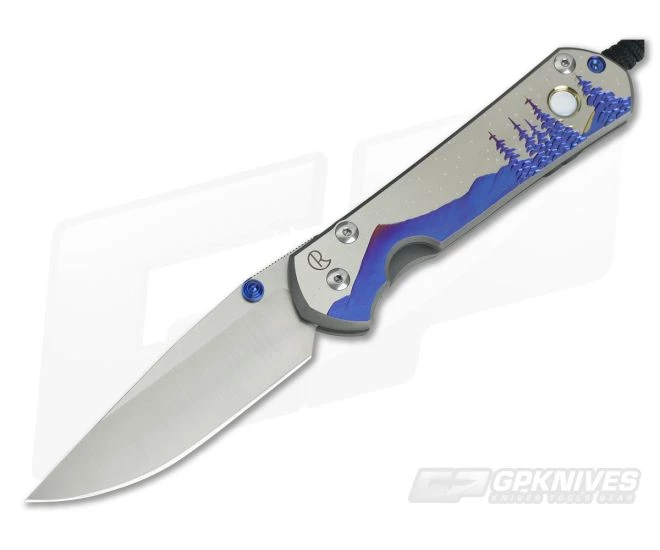 Handle: Made of precision machined and hand finished titanium slabs, the front side of the handle features a “Night Sky” unique mountain graphic while the backside has been bead-blasted for a matte finish. A Reeve Integral Frame Lock holds the blade solidly in the open position and can be simply disengaged. An attached lanyard and titanium tip up carry pocket clip round out this truly one-of-a-kind work of art.