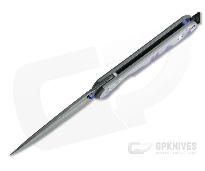 The Chris Reeve Large Sebenza 21 Unique Graphic “Night Sky” with Big Dipper has a stunning mountain and tree scene done in multiple shades of blue/purple. This unique graphic is complete with a starry sky, GP Exclusive Big Dipper constellation and mother-of-pearl cabochon inlay playing the part of the moon shimmering bronze onto the treetops. This version comes with a Chad Nichols stainless Raindrop pattern Damascus steel blade.