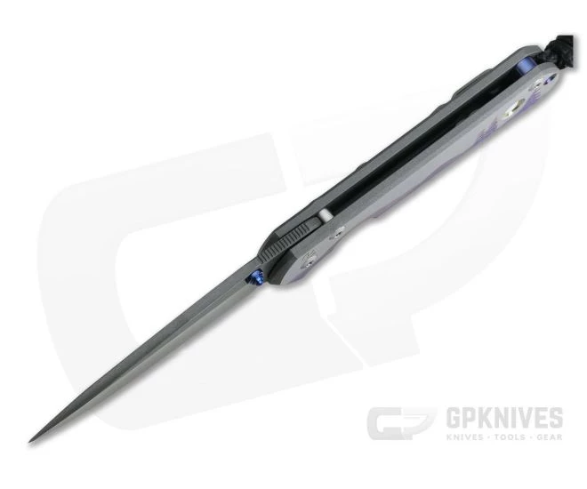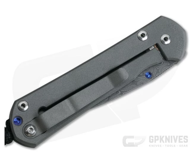 Blade: The Small version gives its user 2.87 inches (7.29 cm) of polished, shaving sharp cutting edge built from premium Chad Nichols stainless Raindrop Damascus steel. It is hollow ground for supreme sharpness and fully usable for day to day. A thumb ramp on the spine has perfect jimping, nearly an inch and perfect placement. The rest of the spine is crowned, smooth and polished. This version features a single Blue titanium thumb lug opener allowing the user to open the blade from the front side. It operates on a pivot system using oversized bronze washers with grease-filled pockets for smooth, no friction operation. Lock up is always solid and reliable.