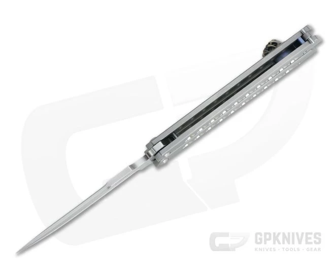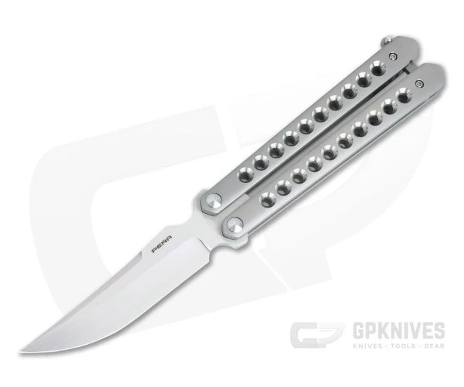 The Custom Pena-Song is a collaboration between designer Jared Van Otterloo and custom maker Enrique Pena. This is the pentacle of high-end Balisong blades, executed with Pena’s renowned fit, finish and attention to detail. This version comes with a hand-rubbed satin, CPM-154 blade, blasted and hole-milled titanium handles and a custom Steel Flame Skull pocket clip.