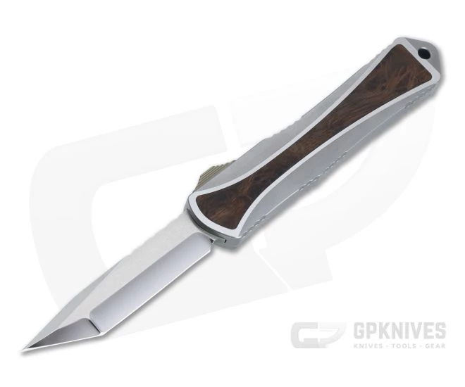 The Heretic Knives Manticore-S is the smallest of the Manticore Series of double action, out-the-front, automatic knives. This very special Hand Ground custom version comes with a stainless steel handle, hand satin flats, desert ironwood inlays and bronze hardware with a hand hollow ground, high polish finished Elmax Tanto blade. S/N 013.