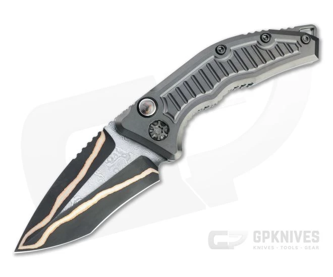 Robust and compact, the Heretic Medusa makes a great tactical everyday carry folder thanks to superb design, build, and materials. A simple, rock solid button lock mechanism activates a snappy coil spring mechanism for decisive and fast deployment, while the straight forward, ergonomically designed handle delivers a secure grip for utility or martial use. This custom version comes with a hand ground, Bakers Forge San Mai Damascus recurve blade, “frag” milled DLC coated titanium handles, matching hardware and Copper Snakeskin Fat Carbon inlaid button and clip. S/N 010