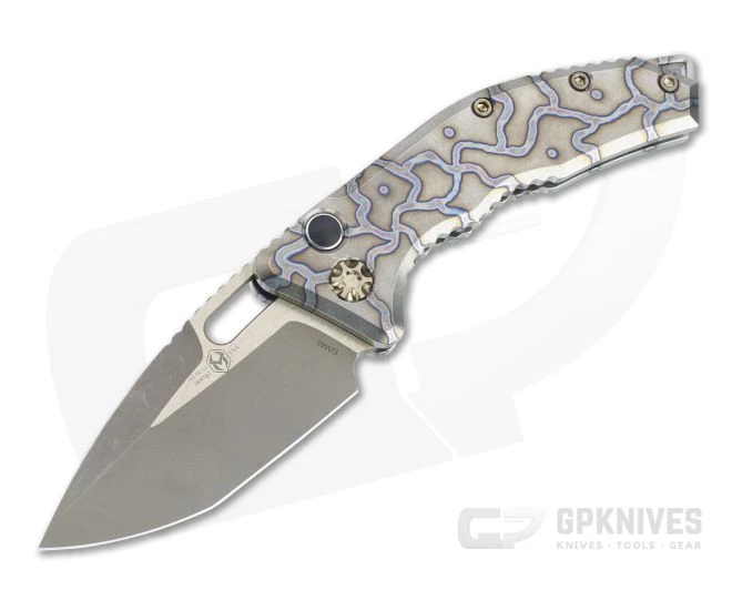 Handle: Two thick slab titanium scales deliver a solid heft in the hand and are tumbled and flame-pattern anodized for a unique style. The edges are chamfered for comfort with strategic jimping for a solid, secure grip. A partial back spacer protects the edge when closed and extends from the pommel for use as an impact tool and lanyard attachment point. Rounded for ease of use, the ironwood button lock mechanism is simple, handsome, and secure. Bronze Torx hardware rounds out the construction.