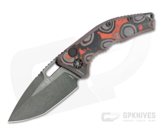 Robust and compact, the Heretic Medusa makes a great tactical everyday carry folder thanks to superb design, build, and materials. A simple, rock solid button lock mechanism activates a snappy coil spring mechanism for decisive and fast deployment, while the straight forward, ergonomically designed handle delivers a secure grip for utility or martial use. This limited version comes with a two-tone Battle Worn DLC Elmax Tanto blade, matching hardware and Orange Camo carbon fiber handle scales.