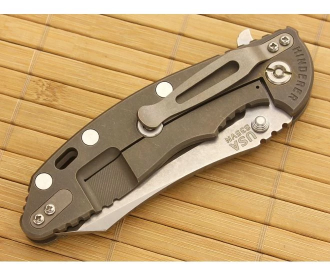The Handle: Full titanium frame lock and liner have a dark bead-blast/tumbled/anodized Battle Bronze Finish. Hardware and standoffs create one tough package while 3D texturing on the G-10 scale coupled with jimping all around create a solid grip. There is a bit of a choil to choke up on the blade for more detailed cutting tasks as well. This Hinderer XM-18 includes the famous Hinderer Lockbar Stabilizer and two-position Battle Bronze titanium clip and insert for tip up or down right hand carry.