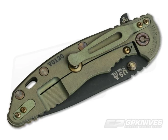 Handle: Full titanium frame lock and liner have a matching Battle Green Finish (anodized green Working Finish) that is rugged and hides wear well while having a classic visual appeal when paired with the handsome Smooth Walnut scale. Bronze Hardware and standoffs create one solid, easy to maintain package. A forward choil, strategically placed jimping and an ergonomic handle design delivers security and control in the hand. Includes the Hinderer Lockbar Stabilizer for added performance.