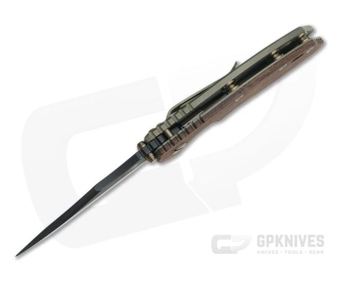 Handle: Full titanium frame lock and liner have a matching Battle Green Finish (anodized green Working Finish) that is rugged and hides wear well while having a classic visual appeal when paired with the handsome Smooth Walnut scale. Bronze Hardware and standoffs create one solid, easy to maintain package. A forward choil, strategically placed jimping and an ergonomic handle design delivers security and control in the hand. Includes the Hinderer Lockbar Stabilizer for added performance. S/N V0961.