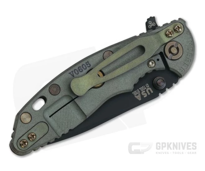 Handle: Full titanium frame lock and liner have a matching Battle Green Finish (anodized green Working Finish) that is rugged and hides wear well while having a classic visual appeal when paired with the handsome Smooth Walnut scale. Bronze Hardware and standoffs create one solid, easy to maintain package. A forward choil, strategically placed jimping and an ergonomic handle design deliver security and control during use. The Hinderer Lockbar Stabilizer delivers added performance. Serial #V0605.