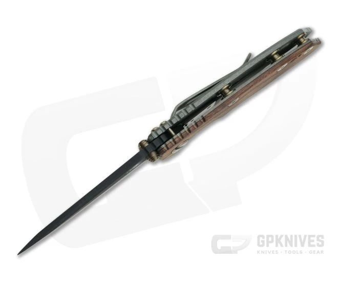 Handle: Full titanium frame lock and liner have a matching Battle Green Finish (anodized green Working Finish) that is rugged and hides wear well while having a classic visual appeal when paired with the handsome Smooth Walnut scale. Bronze Hardware and standoffs create one solid, easy to maintain package. A forward choil, strategically placed jimping and an ergonomic handle design deliver security and control during use. The Hinderer Lockbar Stabilizer delivers added performance. Serial #V0743.