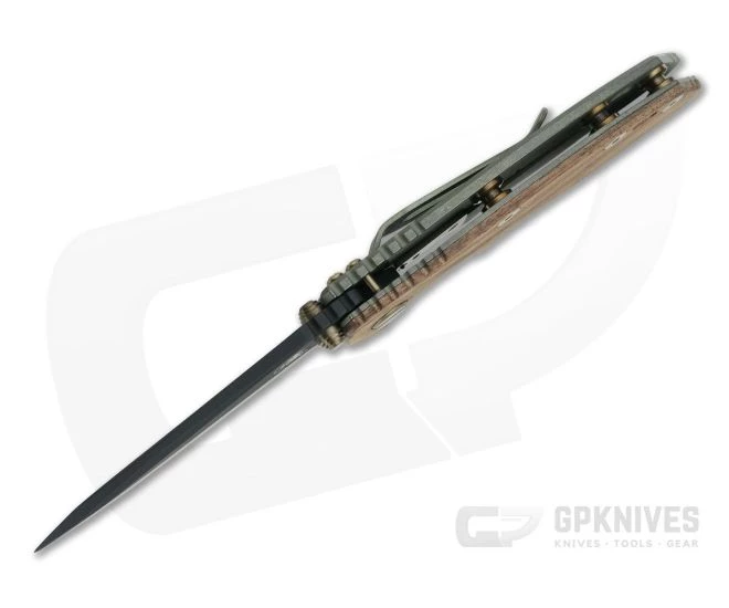 Handle: Full titanium frame lock and liner have a matching Battle Green Finish (anodized green Working Finish) that is rugged and hides wear well while having a classic visual appeal when paired with the handsome Smooth Walnut scale. Bronze Hardware and standoffs create one solid, easy to maintain package. A forward choil, strategically placed jimping and an ergonomic handle design deliver security and control during use. The Hinderer Lockbar Stabilizer delivers added performance. Serial #V0737.
