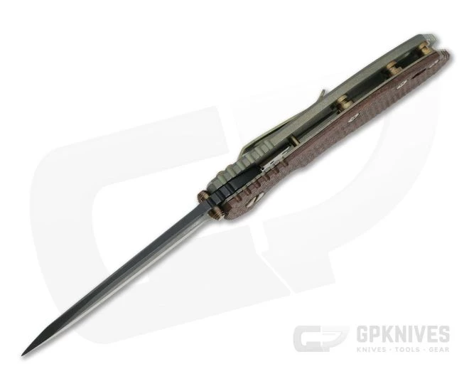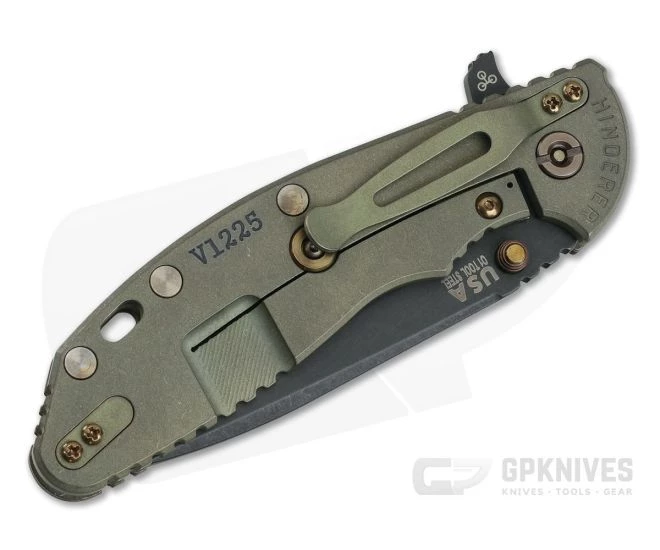 Handle: Full titanium frame lock and liner have a matching Battle Green Finish (anodized green Working Finish) that is rugged and hides wear well while having a classic visual appeal when paired with the handsome Textured Walnut scale. Bronze Hardware and standoffs create one solid, easy to maintain package. A forward choil, strategically placed jimping and an ergonomic handle design deliver security and control during use. The Hinderer Lockbar Stabilizer delivers added performance. Serial #V1225.