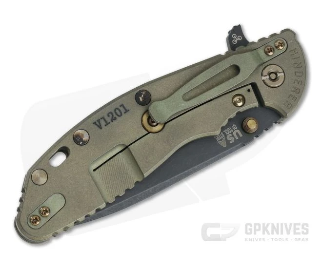 Handle: Full titanium frame lock and liner have a matching Battle Green Finish (anodized green Working Finish) that is rugged and hides wear well while having a classic visual appeal when paired with the handsome Textured Walnut scale. Bronze Hardware and standoffs create one solid, easy to maintain package. A forward choil, strategically placed jimping and an ergonomic handle design deliver security and control during use. The Hinderer Lockbar Stabilizer delivers added performance. Serial #V1201.