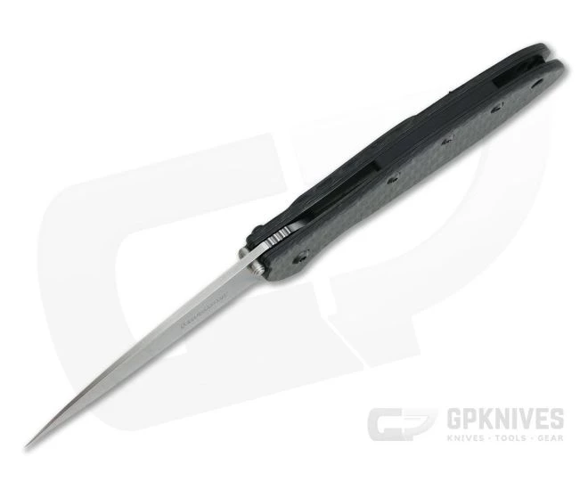 Handle: Solid GITD carbon fiber handle scales are Torx screwed to black coated stainless steel liners, with one forming the lock. The carbon fiber material is an exquisite upgrade of durability, toughness and weight reduction. The Leek is well-balanced and has a great feel in-hand. A Tip-Lock slider safety keeps the blade from deploying unintentionally when closed.