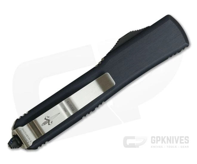Fresh from the Marfione Custom Knife shop comes an Ultratech dual action out the front automatic knife with signature Mirror Polish Finished Elmax Single Edge blade. This custom creation has a brushed and anodized, hefted alloy handle, proprietary blue ringed hardware and lightening-fast, out-the-front operation.