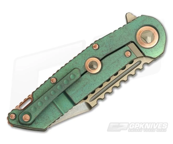 Marfione Custom Warhound flipper is a substantial tool built on a 6AL4V Titanium Frame Lock platform. This Warhound is a beefy tool with some serious heft thanks in part to the full length copper backspacer and hardware accents. This custom flipper comes with a Two-Tone Bronze M390 blade and Antique Green anodized titanium handles and clip.