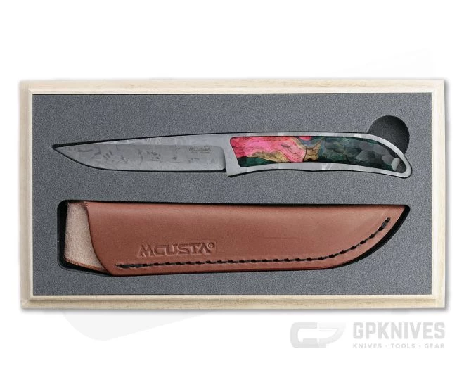 Mcusta’s Platinum Label collection features limited edition knives with top tier materials, precision construction unique hand finishing techniques. Blending traditional Japanese craftsmanship with modern performance and materials, the Platinum Label Slim Line fixed blade offers a truly unique piece for your collection. This Mcusta Platinum Label knife is limited to 90 individually serialized pieces and has a Red stabilized wood handle inlay. S/N – 080