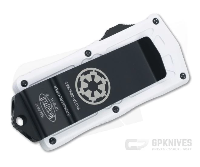 Handle: Tough, lightweight 6061-T6 aluminum in matching white Cerakote forms the handle with rounded edges and strategic jimping for a comfortable, secure grip and a smooth pocket transition. An extra wide “money” pocket clip makes this a prime choice for gentleman’s carry. Proprietary black ringed Microtech hardware, matching lanyard hole knocker end and serialized clip with Imperial insignia round out the construction.