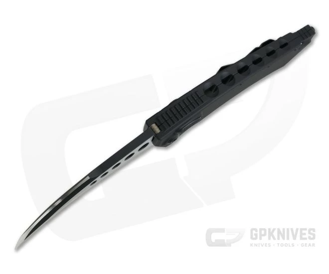 The Microtech Hawk Auto revives the iconic 1996 design with 21st Century updates and aesthetics for a sleeker finish and increased functionality. This Tactical version features a piercing Hawkbill karambit blade with black Cerakote coated, American CTS-204P stainless steel and Black aircraft grade aluminum handle black hardware and a smooth aluminum handle without traction inserts.