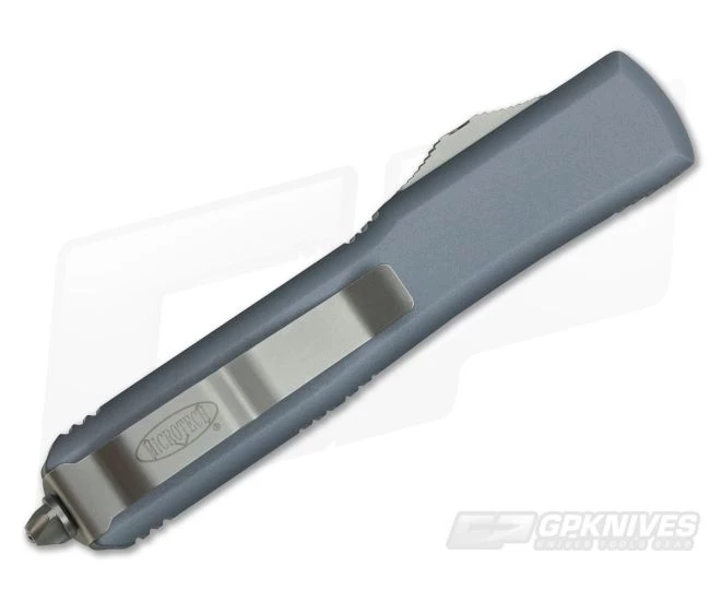 The Ultratech Blade Show 2018 edition dual action out the front automatic knife from Microtech sets the standard for the category. This version has a Grey contoured handle and stonewashed, M390, Bayonet blade.