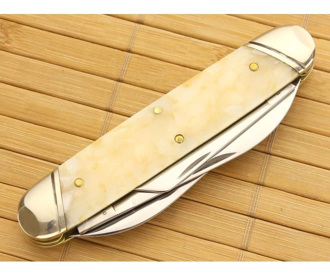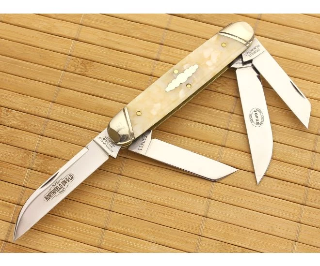 The Northfield #53 Cuban Castro with Crushed Sea Shell perylic will make an excellent addition to an collection. Only 25 pieces were made in this run as each is Serialized on its primary bolster. This is a hefty worker or large show piece with its four polished blades. A Crushed sea shell material shines through beautifully in different lighting and angles.