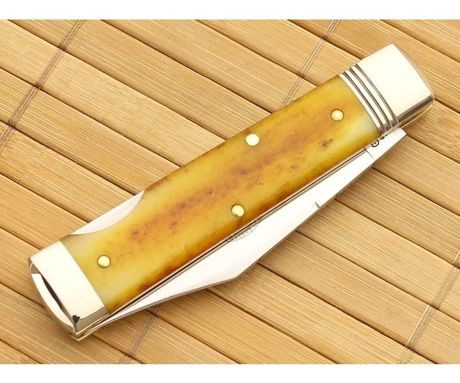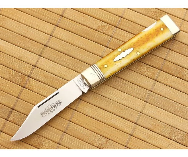 Northfield #99 Wall Street Pattern with handsome smooth autumn gold bone handles give the knife a classy traditional look.This pattern has a wide bolster that tapers down symmetrically to the primary pinched bolster with engraved serial number. These two nickel silver bolsters bookend the bone handle scales that are pinned to brass liners. Finishing off the handle is a smooth shield that is pinned to the front scale. This knife features one 1095 carbon steel blade, a clip point, which was frozen forged and hammer tested before receiving a polished finish. The blade is held open by the secure lock back design that is both tried and tested. Limited edition model: 1 of 35 laser etched on the back side of the blade. These come in a unique tube packaging with company information on the front and is brand new direct from Great Eastern Cutlery.
