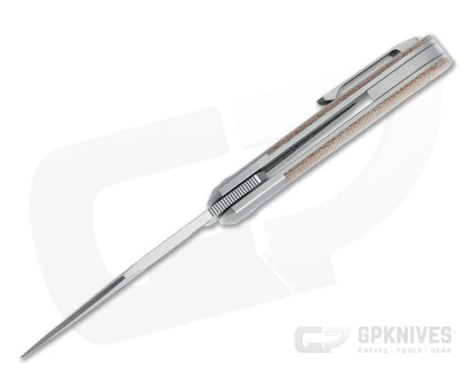 Handle: Simultaneously modern and classic, the handle consists of two thick, media blasted titanium slabs with integral bolsters supporting contoured canvas Micarta covers. Bolsters give a traditional look while titanium and Micarta offer modern performance and good traction. One liner is cut to form the lock and equipped with a steel face for smooth operation and reliably solid lockup for safe use. Construction is completed titanium hardware and partial back spacer.