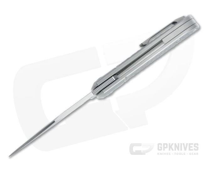 Blade:Â This workhorse design is equipped with a stunning two-tone satin finished, M390 clip point blade. Delivered with a high hollow grind and prominent clip point swedge the blade provides exceptional cutting performance. The well dialed in detent and smooth ceramic bearing pivot allow the blade to be deployed fast or slow utilizing the minimal front flipper tab with jimping for traction.