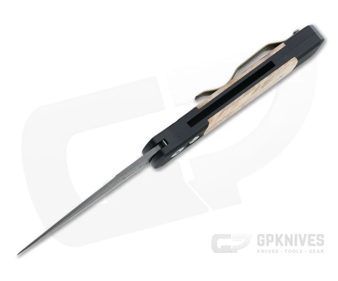 Handle: Contoured black hard anodized 6061-T6 aluminum delivers a comfortable and versatile coffin-shaped handle that draws smoothly from the pocket. Handsome maple burl wood inlays contrast the matte finish of the aluminum handle and pair with the mosaic pin inlay, satin hardware, anodized clip and Damascus blade to make this dress carry ready. The button lock is robust, reliable, and easy to operate.