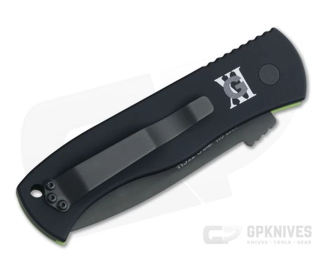 Handle: This Limited production iteration features a layered and textured G10 front with super tough black Class III military grade hard anodized aluminum backside and integral partial backspacer. Protech added notching on the spine to extend the thumb ramp off the blade for more controlled cutting. Construction is rounded out with a lanyard hole, black hardware and GXI lasered logo on backside of the handle.