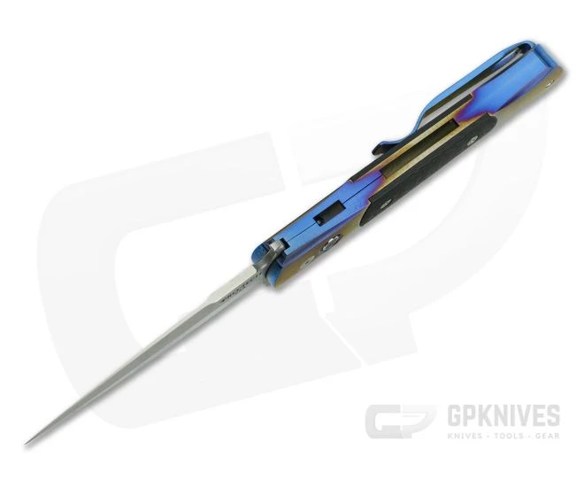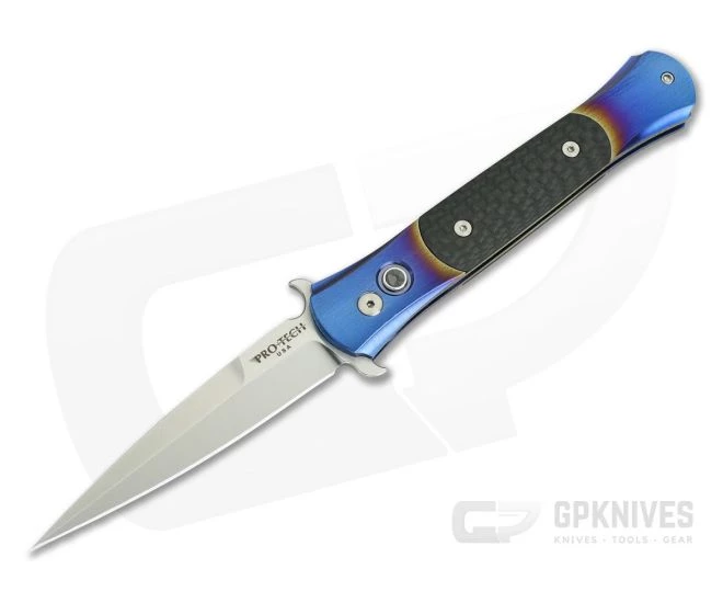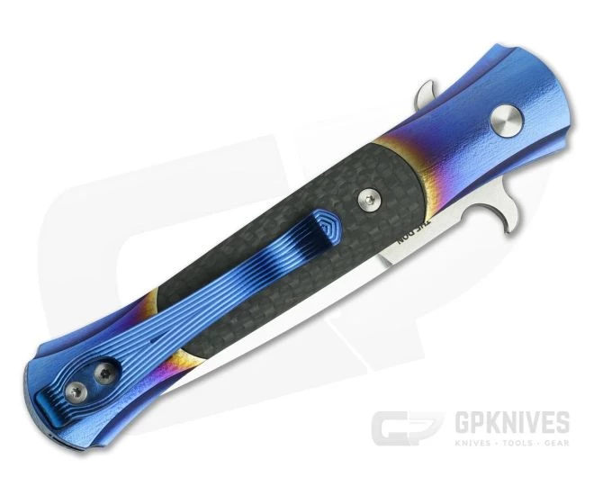 Protech Knives The Don is an full size automatic folder with a distinctive design inspired by traditional Italian folding Stilettos. The Don incorporates Protech’s American innovation of the automatic Stiletto featuring modern materials, high tech manufacturing, advanced coil spring mechanism, and quality American production. This Custom Shop First Time Ever Ti version has a satin finished blade, Orange Peel textured and multi-color anodized Titanium handles, carbon fiber inlaid handle and button and 3D milled and anodized titanium pocket clip.