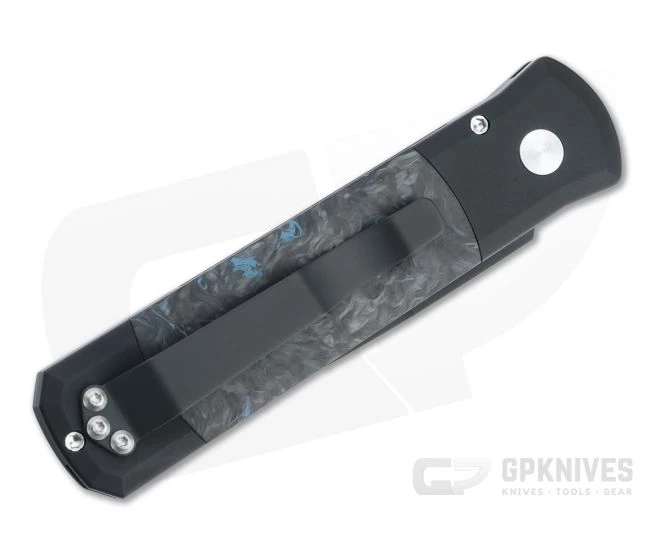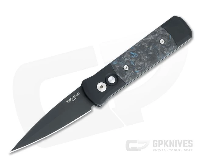 The Protech Knives Godson is a classy, compact, everyday carry version of the larger Godfather. It retains classic lines inspired by traditional Italian folding Stilettos with modern materials, high-tech manufacturing, an advanced coil spring mechanism, and quality American production. This Limited version comes with a black DLC coated 154CM blade and black aluminum handle with Fat Carbon blue Dark Matter carbon fiber inlays.