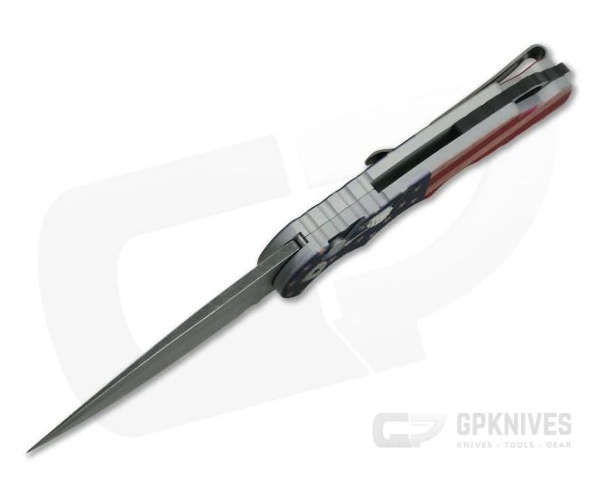 Handle: 6061-T6 Anodized aluminum makes the Tactical Response both tough and lightweight. This custom “Flag” variant has a Vintage Flag pattern anodization done by Peter Kellett. Milled finger grooves provide a comfortable and secure grip in the hand with subtle jimping for indexing. A hardened 410 steel backspacer contains a generous lanyard hole and protrudes from the pommel end of the handle for use as an impact tool. The Tactical Response TR-5 carries via blasted, matte gray, stainless steel deep carry pocket clip set up for right hand, tip-up only carry.