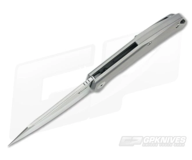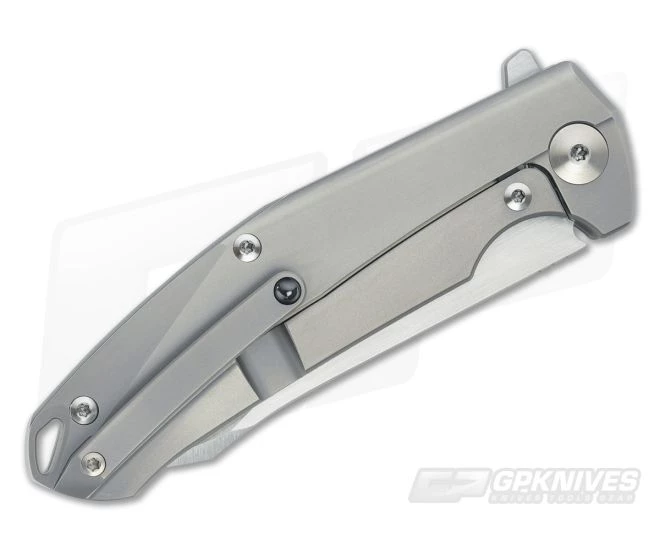 The Handle:Â Fully comfortably contoured titanium has a matte gray bead blasted appearance. Pockets have been milled from the inside frames while a frame locking mechanism is fitted with a steel insert for smooth operation. Shiny hardware contrasts the handle and works in unison with a smooth titanium backspacer.Â