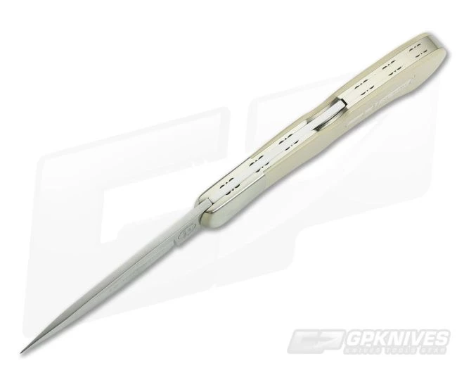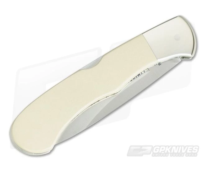 Handle: Ivory White Micarta scales are fit to a single nickel silver bolster which is integral to the thick, file-worked liners that make the foundation of the handle. The display side of the handle sports the infamous “Bullet” shield in sterling silver while the reverse side is unadorned. A simple, stainless steel mid-back lock mechanism provides smooth operation and secure lock up of the blade. Each piece comes with a storage box and certificate of authenticity.