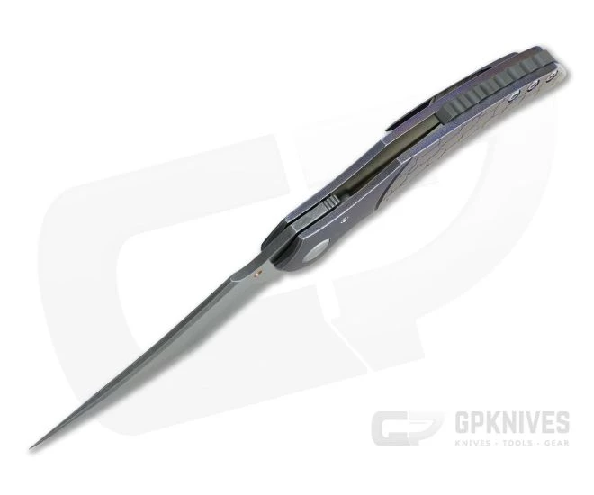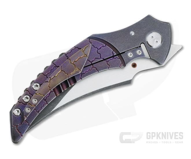 Handle: Built of two thick slabs of 6Al4v titanium, both the front and back of the handle are engraved with faux bolsters and “cracked earth” textured “scales”. Both slabs are fully orange peel textured and anodized for a truly custom feel. A lock bar has been cut out of the lower frame which has an attached D2 tool steel lock face and ceramic detent ball. A matching milled titanium pocket clip, jimped zirconium backspacer, titanium hardware and custom pivot complete this piece.