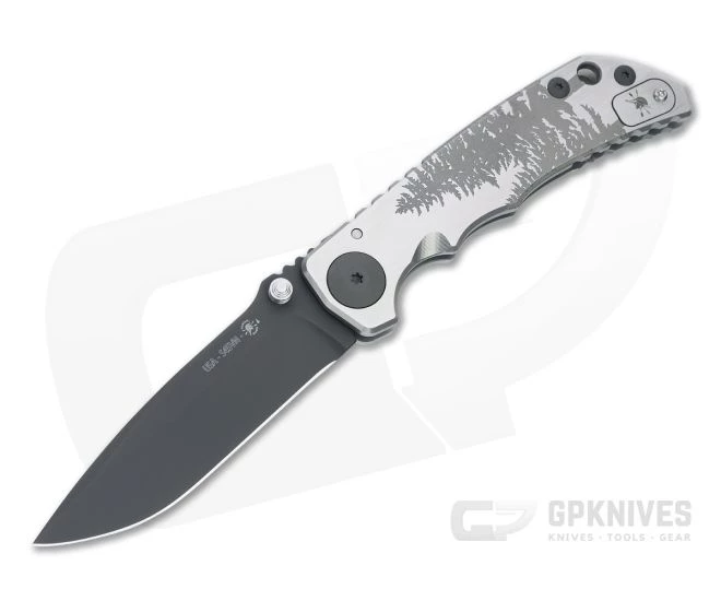 Winner of the “Overall American Made Knife of the Year” for 2016, the Spartan Harsey Folder is now available in a custom “Fir Trees” graphic designed by the man himself, Bill Harsey. This collaborative effort features Bill Harsey’s signature styling combined with premium materials and Spartan’s precision fit and finish. Comfortable in-hand and ready for hard use, this version features a black PVD coated S45VN blade and engraved, satin finished titanium handles. The deep engravings show the subtle silhouette of fir trees for a simple, rugged look with plenty of class.
