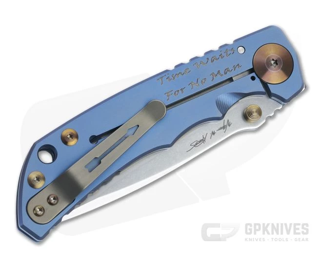 Blade:Â Made from stonewashed S45VN, the classic, utilitarian drop point blade has a top swedge and high saber grind for balanced performance and durability. A heavy stonewashed finish give a rugged look and hides wear from use. Riding on reliable bronze washers, the blade deploys fast and smooth via dual titanium thumb studs. Aggressive jimping on the thumb ramp offers added traction and a point for indexing.